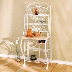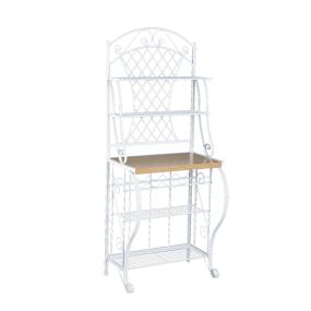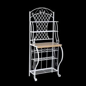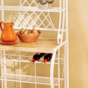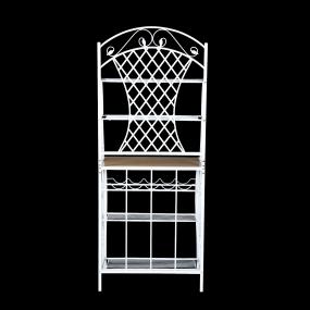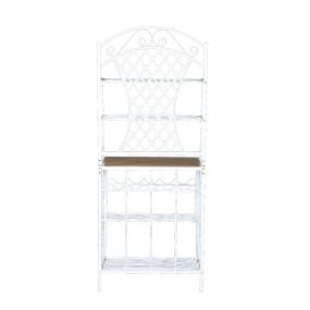 Crafted for style and function, this country chic bakers rack is a welcome addition to any kitchen. Constructed of metal for durability, the frame contains many ornate details such as the scrolled legs, shelf braces, and decoration. The top edge has a decorative arch with leaf accents that sits atop the attractive trellis back. This lovely bakers rack has 4 wire shelves, a 5 bottle wine rack, and an ample counter space for all your storage needs.
